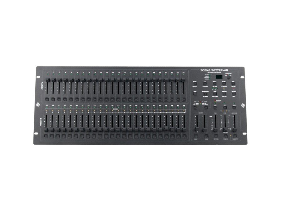 Take your shows to the next level with the essential Scene Setter from ADJ. This 48 channel dimming console will give you the power to create the light show of a lifetime. Tying in your audio and visual production, the scene setter synchronizes the music with your lights and fog machine while also allowing for individual adjustment to each of your lights with it’s 48 adjustable fade bars. With 4200 programmable scenes and 48 programmable chases (all password protected) you can rest easy that your unique set-up is kept secure while it runs 12 chases simultaneously. Adjust your fixtures in either percentage or DMX value to get the dimming effect desired. With its low weight and bright LCD display you’ll have no trouble moving this controller where it’s needed and getting it set up. Master your entire entertainment system with the ADJ Scene Setter DMX Dimming Console, and create a light show your crowd won’t forget.