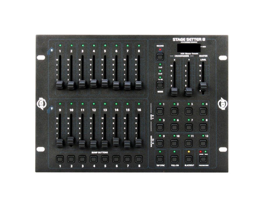 For the effective control of par cans via dimmer packs the Stage Setter 8 from ADJ offers versatility of operation through 3 different operating modes, four build-in programs, and eight user programmable programs. It operates using standard DMX-512 protocol, is MIDI compatible, and includes a fog machine output control.