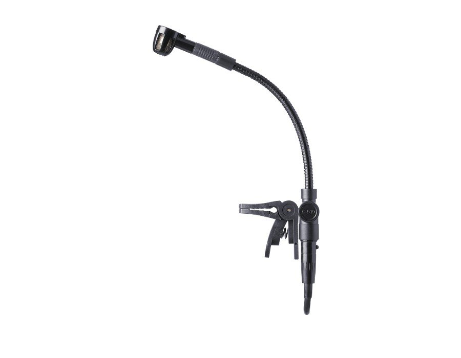The C519 professional miniature condenser microphone clips gently onto the bell of a trumpet, saxophone, trombone, tuba, didgeridoo or any other wind instrument. Its tight cardioid polar pattern makes the C519 an ideal tool for use near monitor wedges, and its flat frequency response delivers a natural powerful and clear sound.