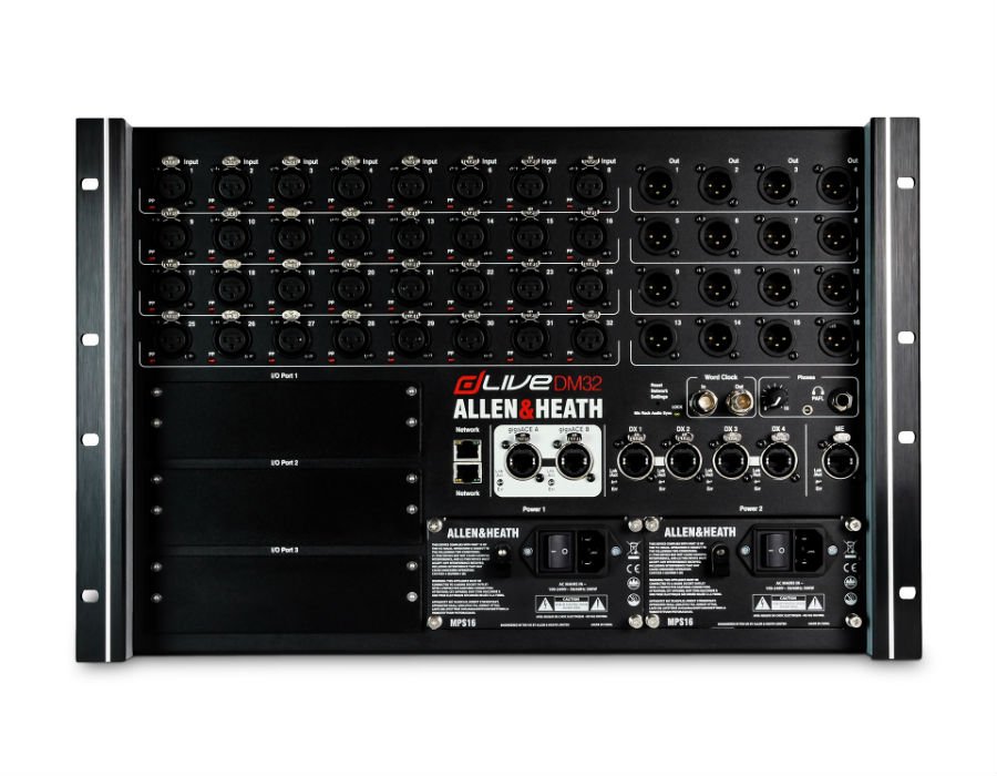 The MixRack DM32 is the heart of any dLive system. It houses the XCVI processing core complete with audio I/O, control and audio networking ports. It is typically connected to a dLive Surface, but can also be controlled at the same time as or even without a Surface using a laptop or iPad, Allen & Heath IP remotes or third party controllers via TCP/IP.