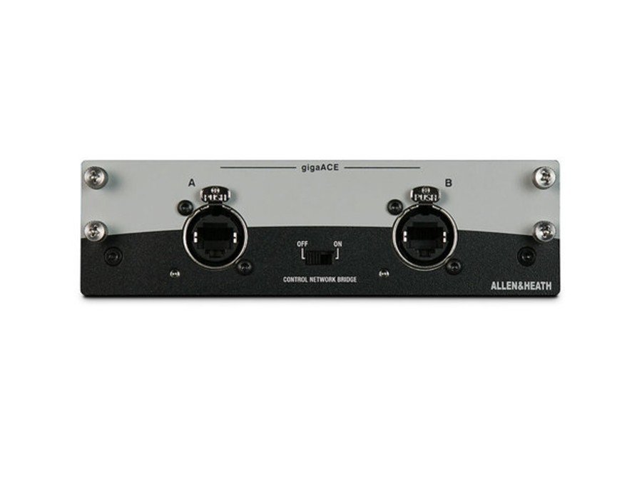 The gigaACE audio networking card (M-DL-GACE) is one of several audio networking options that can be fitted to any Allen & Heath dLive or Avantis I/O Port. It provides a 128x128ch 96kHz gigaACE point-to-point link to another dLive or Avantis mixing system. It also enables connection from a dLive system to the DX Hub or GX4816 expander.