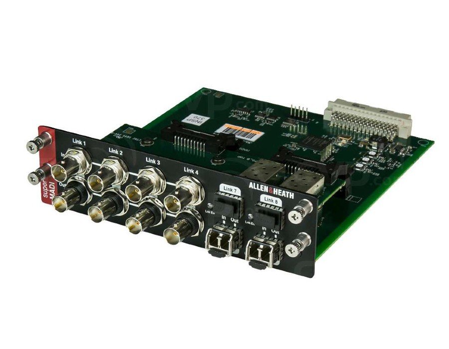 The superMADI audio networking card (M-DL-SMADI-A) is one of a portfolio of audio networking options that can be fitted to any Allen & Heath dLive or Avantis I/O port. Designed to help integrate dLive and Avantis into a wide range of broadcast, live interface and recording scenarios, the superMADI interface card has numerous connectivity possibilities, including 8 BNC connectors and 4 SFP slots for fibre optic transceivers (not included). Both coaxial and optical formats offer up to 128 I/O at 96kHz each, and redundancy and sample rate are switchable per link pair, with a choice of Smux or HighSpeed 96kHz mode. The superMADI card can also be used by engineers and rental companies to link to any MADI-enabled third party console, allowing high-channel count digital splits, for example, between FOH and Monitors.