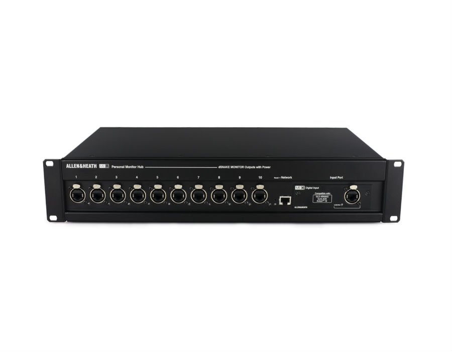 ME-U is a touring grade, 10 port PoE hub providing power and audio to connect multiple ME-1 personal mixers. It comes with a standard input card to interface with GLD and Qu dSnake, dLive, iLive ACE or Aviom® A-Net®. This card can be replaced with a MADI, Dante, Waves SG or EtherSound card to take a digital feed of up to 40 sources from third party systems.