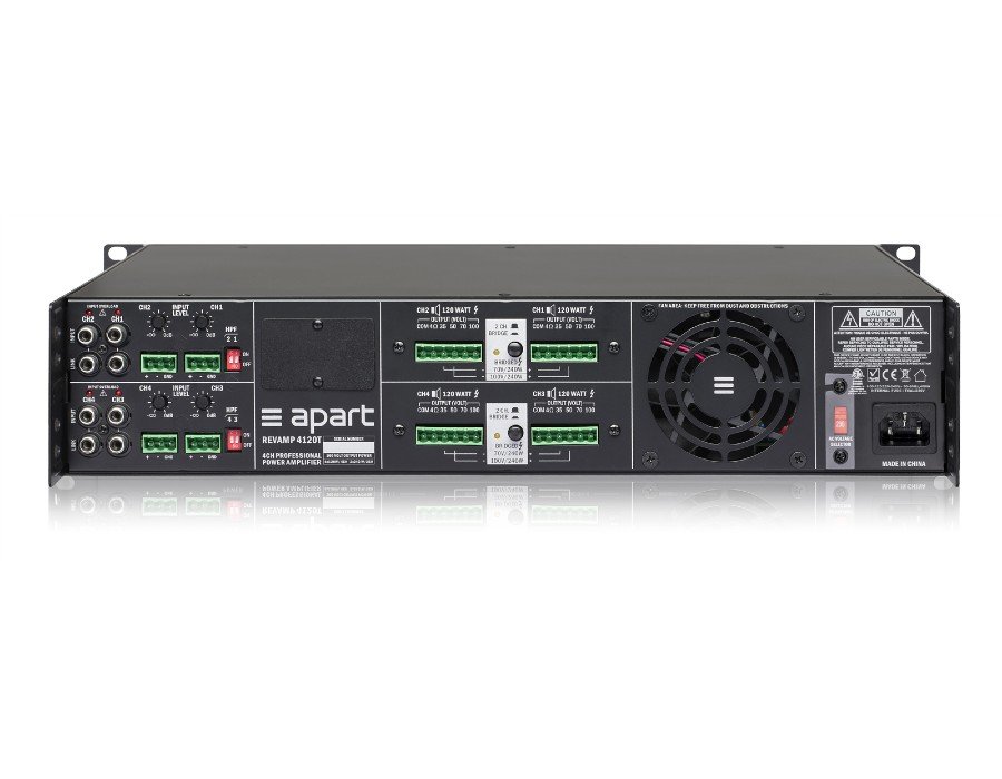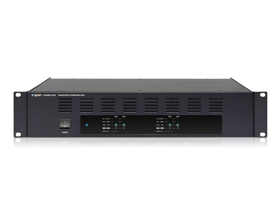 REVAMP4120T is a professional 4-channel digital power amplifier with 4 x 120 watts output power @ 100 volt (or @ 4 ohms), but the unit is also bridgeable to 2 x 240 watts @ 100 volt (or @ 4 ohms). The unit incorporates a highly efficient SMPS power supply, outputs with efficient Class D output topology and output transformers.
