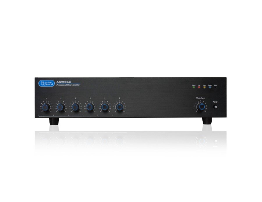 The AA200PHD is a six input channel mixer amplifier designed for distributed business paging and background music (BGM) systems, medium to large speech privacy systems, and in applications where music on hold (MOH) plus paging is required. With four balanced microphone/line inputs and two stereo summing line inputs, the AA200PHD will accommodate a variety of input sources including paging microphones, media players, and digital music receivers.