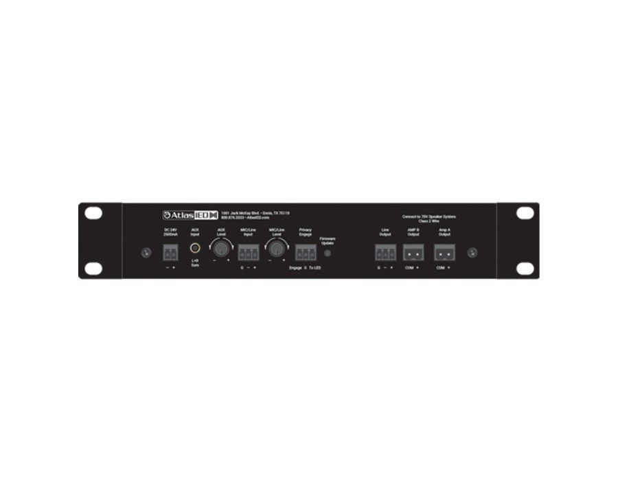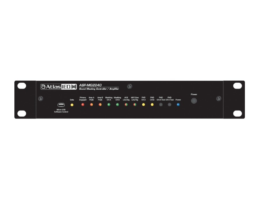 The AtlasIED ASP-MG2240 is a two-zone sound masking controller with integrated amplification. This compact device incorporates many useful features including two-channels of amplification, separate analog masking generators with EQ, 24/7 scheduler, balanced Mic/line input, auxiliary input for background audio and a line output. The PC control software allows the user to customize the system to meet installation needs. Settings can be stored in the unit or in the PC for file back up or recall. The ASP-MG2240 offers industry leading preconfigured presets that are tailor made for many common and advanced sound masking applications. These settings are based on proprietary Chanaud Masking Filters.