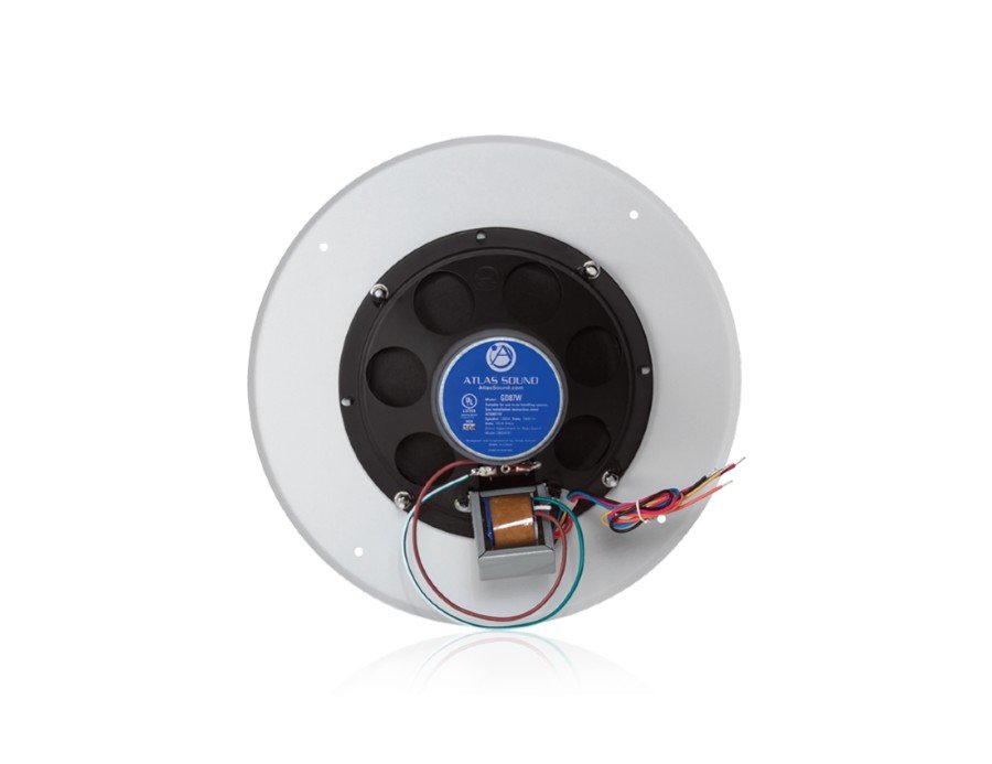The DD87W-HC includes a factory installed 62-8 style CRS baffle with concealed speaker mounting studs and includes screw mount hardware. The baffle finish is white powder coat epoxy and is completed with an application of AtlasIED proprietary Hyfidrophobic treatment that resists moisture allowing the unit to be used in high moisture environments.