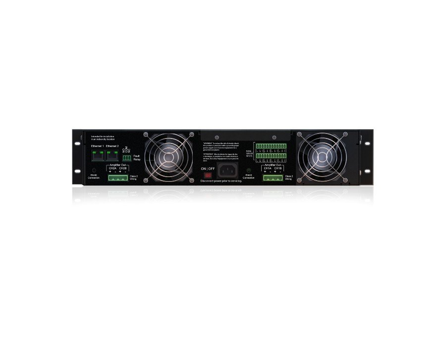 The DNA2404CH features LED indicators for power, audio signals and fault status. A Form C relay is also included that will indicate that a fault is present. The DNA2404CH provides 600 watts per channel for 100-volt transformer-distributed speaker systems and operates from a 220 VAC power source.
