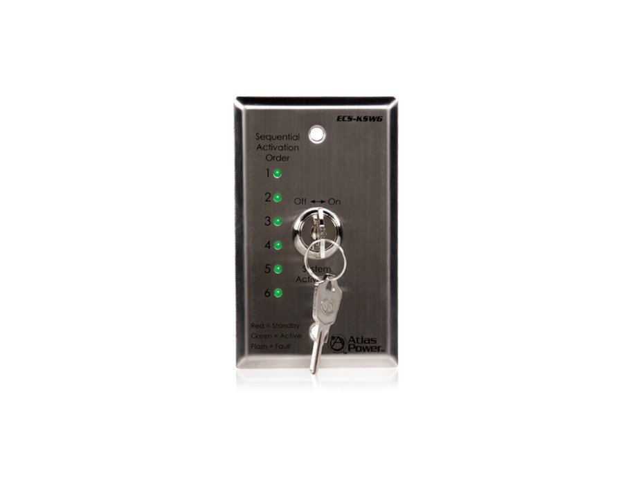 The ECS-KSW6 is a single gang electrical cover plate that works in conjunction with the ECS-6RM system controller. The ECS-6RM system controller can be remotely activated and each channel can be monitored using the ECS-KSW6 control panel. This panel can be placed several hundred feet away from the ECS-6RM controller. A Keyed On / Off switch is provided for security. There are six Bi-Color LEDs on the ECS-KSW6 panel. One LED for each of the six sequenced channels of the ECS-6RM. These LEDs mimic the Channel Activation LEDs that are on the front of the ECS-6RM panel. Wiring the ECS-KSW6 panel requires a RJ45 connector and 8 conductors. It is recommended to use CAT5 cable.