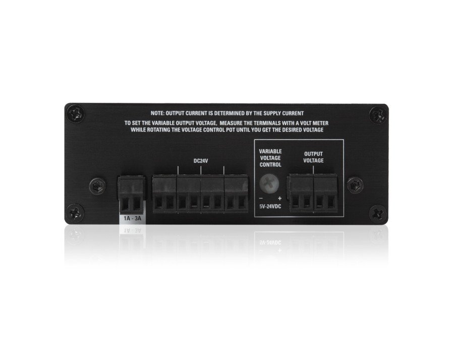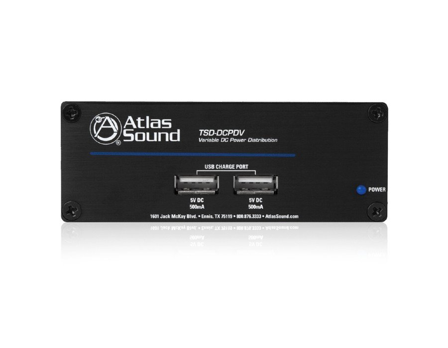 The TSD-DCPDV is designed to distribute power to TSD devices or other equipment requiring DC power and is also ideal for use with wireless microphones that typically require 12-18VDC PSUs. Rear panel includes one 24V input for a user selectable power supply up to 2500mA, four fixed 24V outputs and two 5-24V variable outputs. Voltage for variable outputs is adjusted from a secure trim pot. In addition, two front panel USB ports are available for charging other devices or for USB style rack lighting.