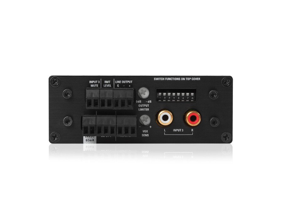 Priority paging can be accomplished via contact closure or VOX trigger on Input 1 (mutes input 3 only). Remote level control feature allows use of the AAVC-10K (or equivalent) decorative wall plate control for convenient remote adjustment of either the entire mix bus or input 3 only (typical BGM input). A variable output limiter provides system protection by reducing clipping and distortion – which is especially useful when mixing multiple mics and/or line sources with varying volumes.