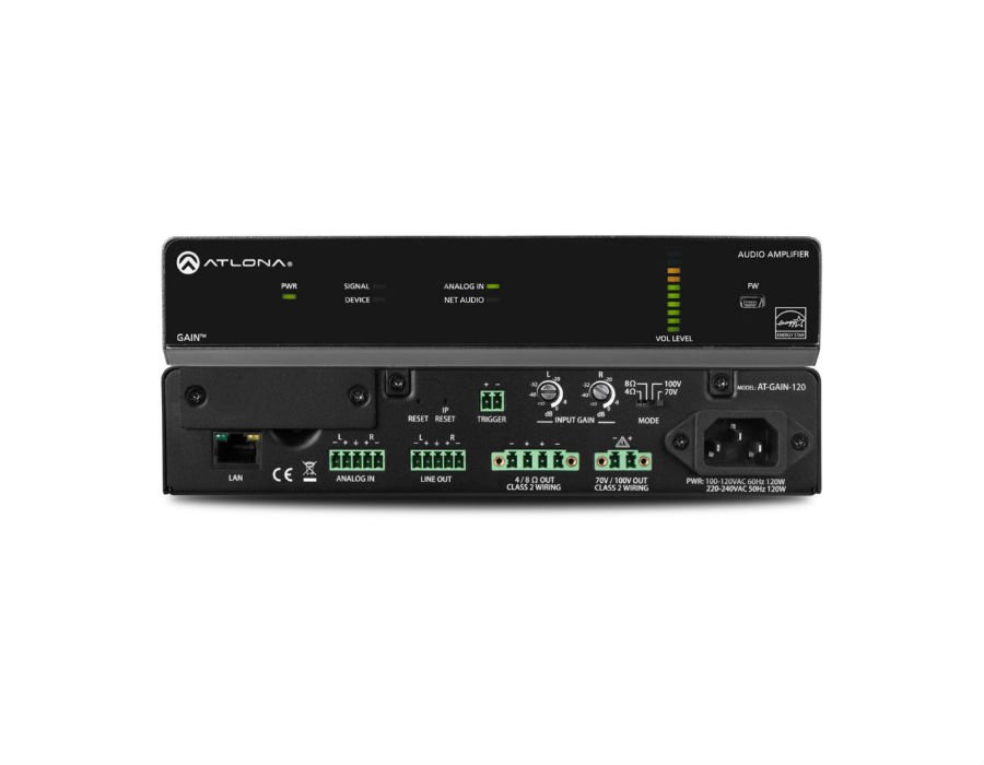 The Atlona Gain™ 120 (AT-GAIN-120) is a compact power amplifier designed for low or high impedance applications. A mode selector switch allows the Gain 120 to deliver two channels of 60 watts each into 4 or 8 ohms, or a single channel of 120 watts at 70 or 100 volts. This Class D amplifier is energy efficient and ENERGY STAR qualified, and is also convection cooled to allow installation in conference rooms and quiet installation environments without the need for fans. In addition to the amplified speaker output, a line level audio output allows the incoming audio to be fed into an additional amplifier or audio system. The Gain 120 is controllable via TCP/IP or external trigger, and can be integrated with Atlona AV switchers and OmniStream™ AV systems for a wide variety of sound reinforcement applications.