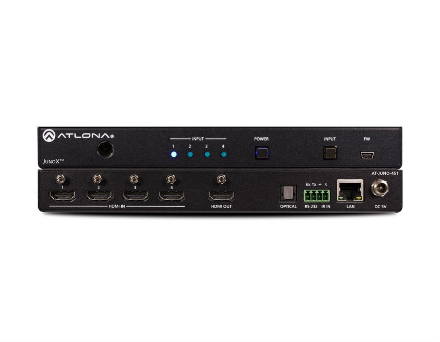 The Atlona JunoX™ 451 (AT-JUNO-451) is a 4×1 HDMI switcher for high dynamic range (HDR) formats. Part of the comprehensive family of Atlona 4K HDR integration products, it is HDCP 2.2 compliant and supports 4K/UHD video @ 60 Hz with 4:4:4 chroma sampling, as well as HDMI data rates up to 18 Gbps. The JunoX 451 is ideal for residential applications with the latest as well as emerging 4K/UHD and HDR sources and displays. It is compatible with all video resolutions, audio formats, and color space formats supported in the HDMI 2.0b specification, plus the ability to pass metadata for HDR content. The JunoX 451 includes EDID management features and automatic input switching. It also supports the HDMI Audio Return Channel (ARC) for receiving digital audio from a television. A TOSLINK digital audio output is provided for sending ARC or de-embedded HDMI audio to an AV receiver or soundbar. This JunoX Series HDMI switcher can be controlled via Ethernet, RS-232, and IR. A handheld IR remote control is included.
