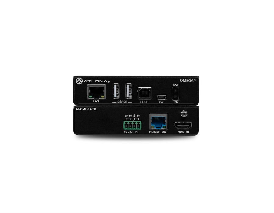 The Atlona AT-OME-EX-TX is an HDBaseT transmitter for video up to 4K/60 4:2:0, plus embedded audio, control, Ethernet, and USB over distances up to 330 feet (100 meters). Part of the Omega™ Series of integration products for modern AV communications and collaboration, the OME-EX-TX is HDCP 2.2 compliant and transmits IR, RS-232, and IP control signals. With a matching HDBaseT receiver, the integrated USB extension addresses the challenge of connecting between USB devices at remote locations, and is ideal for software video conferencing and touch or interactive displays. The OME-EX-TX includes a USB 2.0 host interface for a PC, plus two peripheral devices such as a speakerphone, microphone, or keyboard and mouse. This transmitter is ideal for use with Omega Series receivers as well as switchers with HDBaseT inputs. Also available is the OME-EX-KIT which includes the OME-EX-TX and OME-EX-RX.
