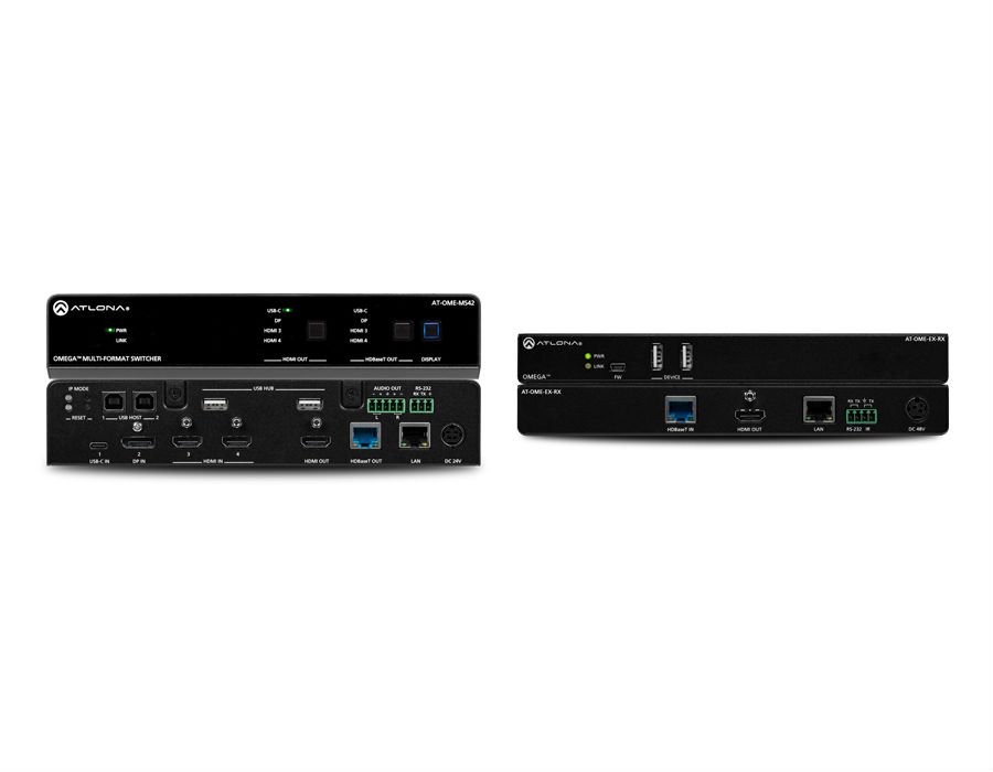 The Atlona AT-OME-MS42 is a 4×2 matrix switcher with HDMI, USB-C®, and DisplayPort inputs, plus HDMI and HDBaseT outputs. It is also available as the AT-OME-MS42-KIT with the AT-OME-EX-RX receiver. Part of the Omega™ Series of integration products for modern AV communications and collaboration, the OME-MS42 is HDCP 2.2 compliant and features HDBaseT extension for video up to 4K/60 4:2:0, plus embedded audio, control, Ethernet, and USB over distances up to 330 feet (100 meters). All inputs and the local HDMI output support 4K HDR and 4K/60 4:4:4 at HDMI data rates up to 18 Gbps. Additionally, 4K downscaling to 1080p @ 60, 30, or 24 Hz is available for the HDMI output when connected to an HD sink. The integrated USB extension addresses the challenge of connecting between USB devices at remote locations, and is ideal for software video conferencing and touch or interactive displays. The OME-MS42 includes USB 2.0 and USB-C interfaces for three host PCs, plus two peripheral devices such as a camera, microphone, speakerphone, or keyboard and mouse. It is available with the OME-EX-RX receiver as the OME-MS42-KIT.