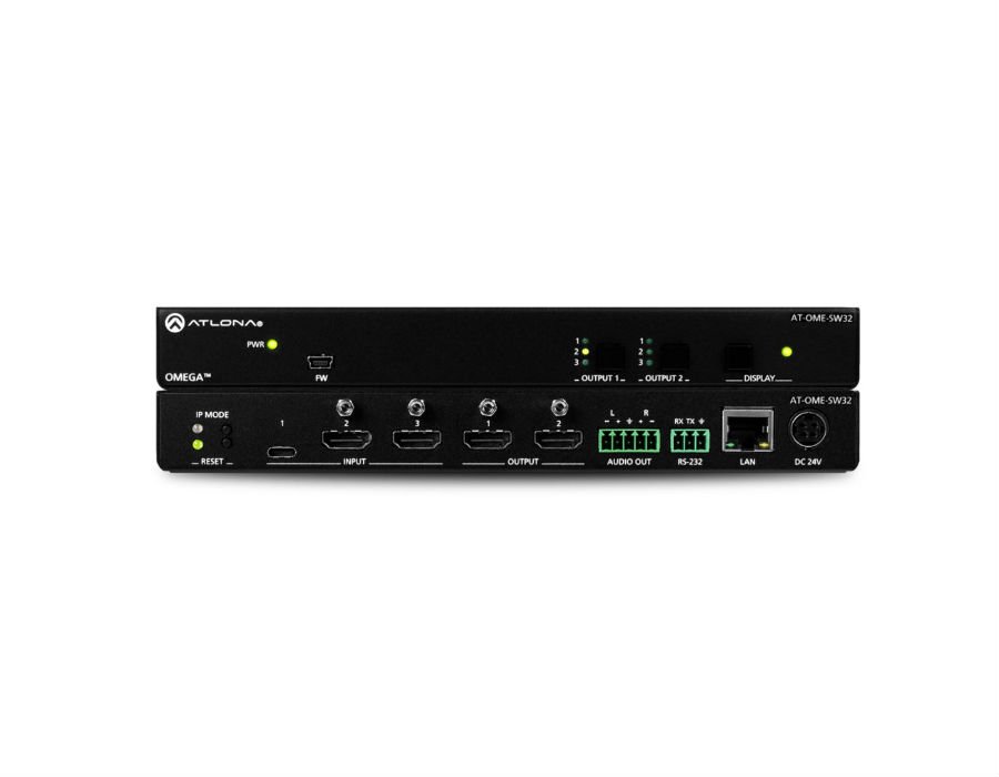 The Atlona AT-OME-SW32 is a 3×2 matrix switcher with HDMI® and USB-C inputs, and HDMI outputs. Part of the Omega™ Series of integration products for modern AV communications and collaboration, the OME-SW32 is HDCP 2.2 compliant and supports 4K HDR and 4K/60 4:4:4 at HDMI data rates up to 18 Gbps. The USB-C input is ideal for AV interfacing with Mac®, Chromebook™, and Windows® PCs, as well as smartphones and tablets. Additionally, 4K downscaling to 1080p @ 60, 30, and 24 Hz is available for one of the HDMI outputs when connected to an HD sink. Depending on the intended application, the OME-SW32 can be set to specific switching modes that include mirrored outputs (default), one of the outputs fixed to an input, or unrestricted matrix switching.