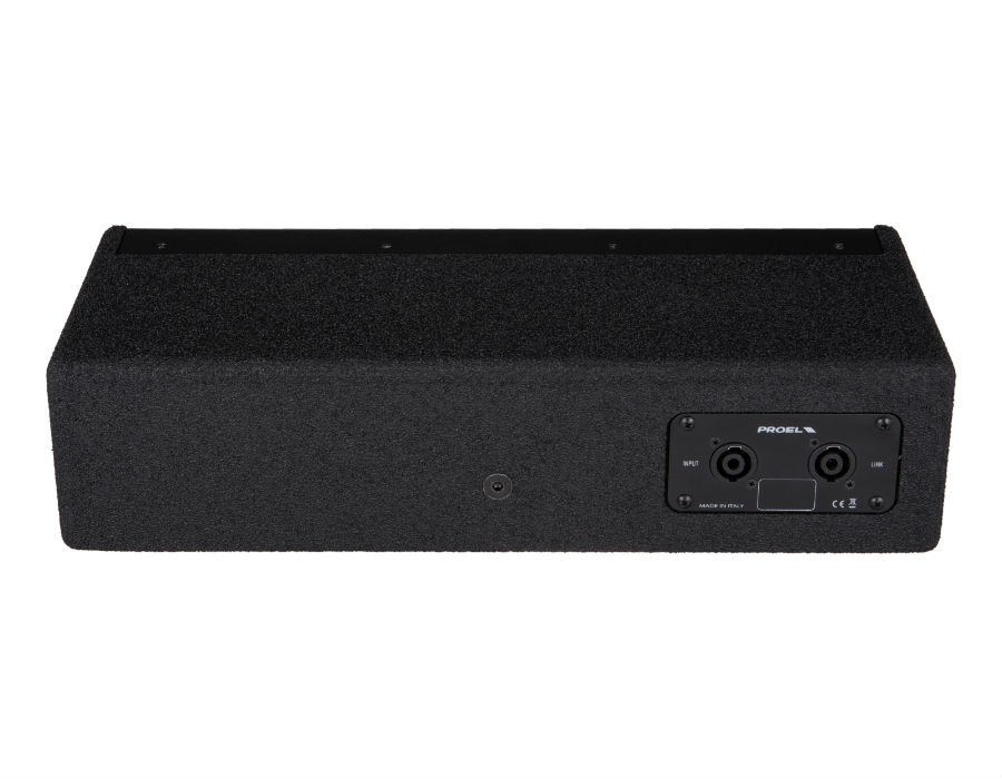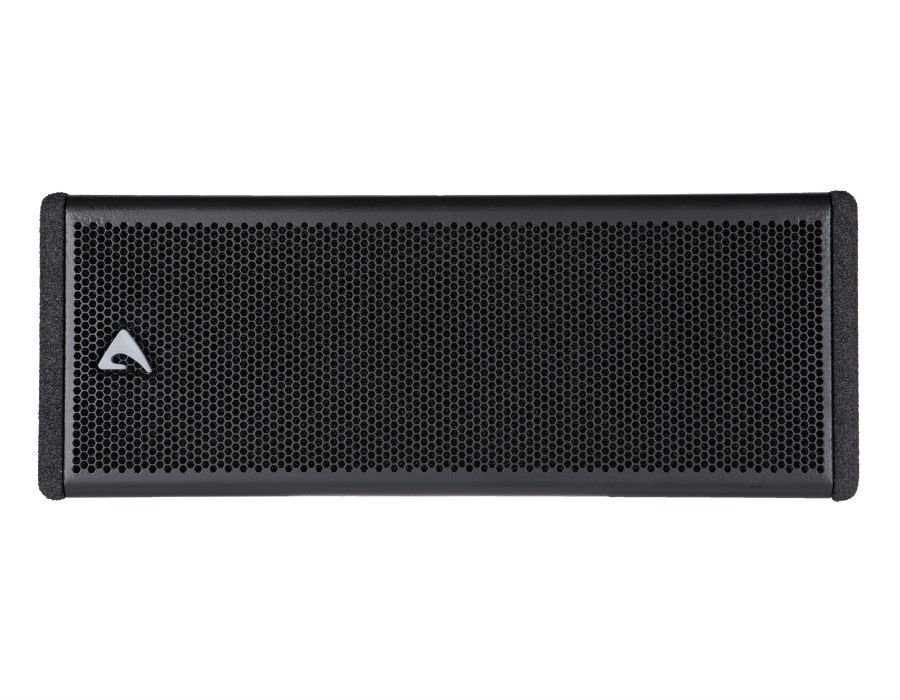The cabinet is trapezoidally shaped, and also asymmetrical, and this profile not only allows the assembly of small clusters using the integral flypoints, but also enables it to be suspended horizontally very close to a ceiling or placed on a stage front as a low profile monitor.