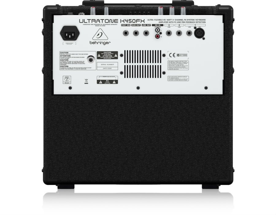 The 45-Watt ULTRATONE K450FX excels as an extraordinarily-versatile keyboard and drum amplifier, as well as a high-quality 3-channel Public Address (PA) system, with a world-class, 10″ BUGERA Speaker – all in one compact and easy-to-transport package. Specializing in rich, accurate tone and professional features, such as a studio-grade Multi-FX Processor and our own FBQ Feedback Detection System, this powerful workhorse will bring out the best in your performance gig after gig.