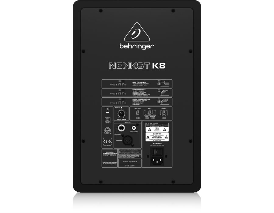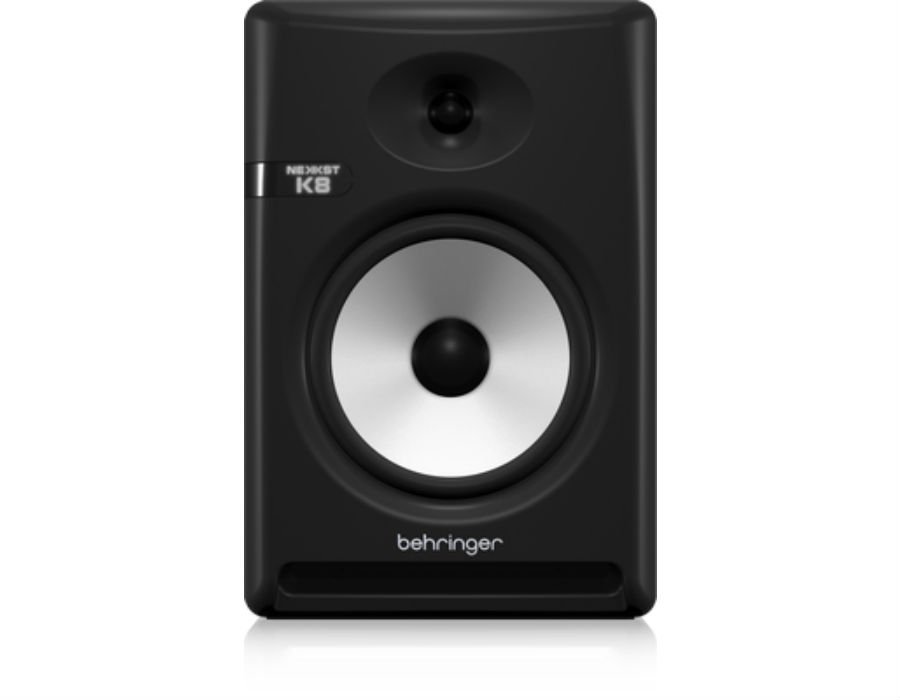 The 150-Watt NEKKST K8 Studio Monitor’s unparalleled, world-class performance is the result of a major collaboration between BEHRINGER audio engineers and loudspeaker master-designer/founder of KRK – Keith R. Klawitter. This incredible reference system is ideal for all critical listening environments thanks to the custom-engineered bi-amplification system that features separate amplifiers for the 8″ glass-fiber woofer and 1″ silk-dome tweeter. K8’s long-throw woofer generates deep, tight bass and virtually smear-proof mids, while the ultra-high resolution tweeter provides sparkling highs – all enhanced by Keith’s Advanced Waveguide Technology for an extremely generous sweet spot.