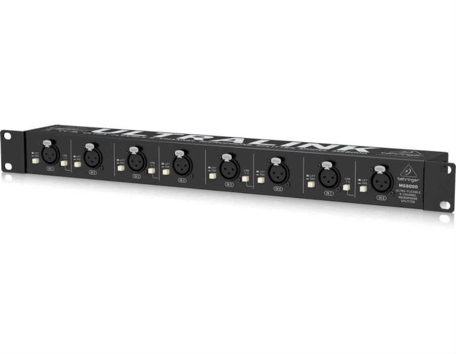 The 1RU MS8000 features 8 XLR Input sockets on the front panel for your mics and DI boxes, along with a LIFT/GND switch to eliminate hum or other noise from ground loops. Each channel features an XLR Direct Out connector, which outputs a post-transformer copy of the input signal, and a second XLR Link Out connector sends a pre-transformer copy of the input signal. This configuration allows sending your Direct Out signals to the FOH or recording console, and the Link signals to your monitor board or phones mixer – making the MS8000 the ideal choice for both your live performances and the studio.