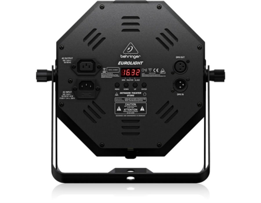 The EUROLIGHT OCTAGON THEATER OT360 can be operated by lighting control signals based on the DMX standard, which is a protocol developed to overcome the inconsistencies in non-standardized or proprietary lighting systems. Fully compatible with the incredible EUROLIGHT LC2412 and LC2412V2 (not included), next generation EUROLIGHT DMX controller (not included) and any DMX official controller devices (not included).