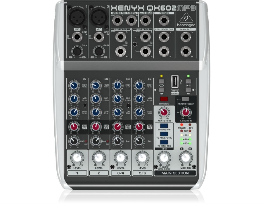 The ultra-compact XENYX QX602MP3 2-bus mixer’s 6 Inputs (2 mic, 2 stereo) allow you to effortlessly achieve premium-quality sound, thanks to its 2 onboard studio-grade XENYX Mic Preamps with available Phantom Power, and our ultra-musical “British” channel EQs. Add to this a high-performance MP3 player for accessing audio files from a USB stick, and a built-in 24-bit, stereo multi-FX processor with presets for studio-class reverb and delay, and the QX602MP3 becomes an incredibly versatile – and amazingly affordable mixer!