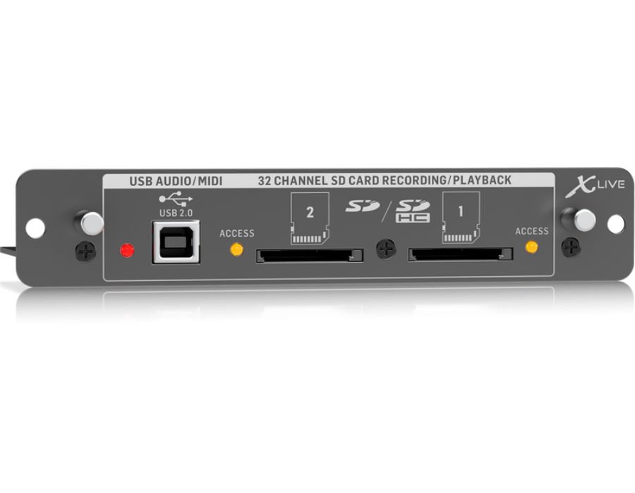 The X-LIVE interface card expands on the already stellar performance of the X-USB card that has been standard in X32 consoles for years. The same 32-channel bi-directional audio I/O via USB 2.0 is available, providing 32 channels for recording and playback, plus remote operation of your DAW via HUI/Mackie Control emulation. The addition of dual SD/SDHC slots provides fully independent recording and playback of up to 32 channels of uncompressed WAV files in consistent sessions – up to the maximum capacity of the SD cards. Multi-channel recording without a laptop, as well as virtual sound checks, live backing-track support, accurate marker handling and manipulation, and full remote operation from PC, Android* or iPad* apps and X-TOUCH control surfaces. All of this barely begins to scratch the surface of what X-LIVE can bring to your X32.