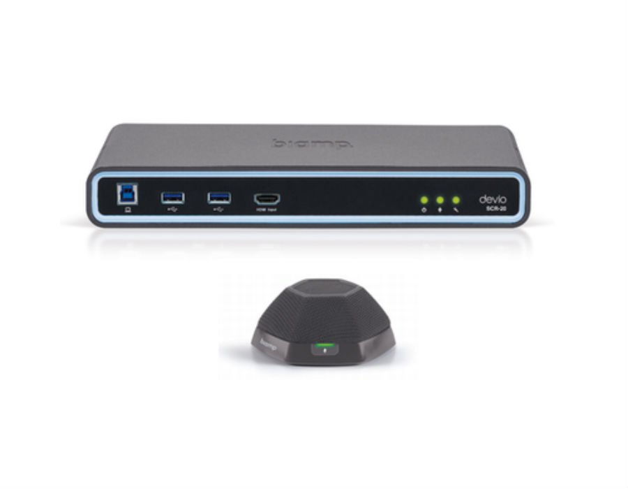The Devio SCR-20 is a conferencing hub that provides users with exceptional AV experiences when using web-based conferencing systems. Intended for huddle rooms or small conference rooms, the SCR-20 uses Beamtracking microphones and professional grade DSP to optimize the audio quality, allowing far-end conference participants to experience the conversation naturally. The Devio SCR-20 supports a variety of room designs for computer-based conferencing including a BYOD approach or connection via a dedicated in-room PC.