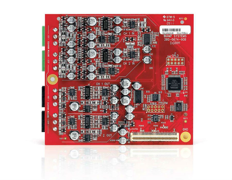 The Tesira EIOC-4 expander card is an optional card that can be installed in the Tesira EX-MOD and all Tesira amplifiers. Each EIOC-4 provides two channels of mic or line level audio input and two channels of mic or line level audio output. The inputs and outputs are electrically balanced and provided on plug-in barrier strip connectors. Software control of each input includes gain with clip indicator, +48V phantom power, mute, level, and signal invert; whereas control for each output includes mute, level, signal invert, and full-scale output reference.