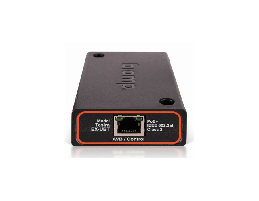 The EX-UBT is a compact remote expander that uses the AVB networking protocol to extend USB and/or Bluetooth sources back to a rack-mounted Tesira server-class device. A standard USB cable connects the host computer to the EX-UBT. CAT5e cabling or better is required for the network connection, with a maximum distance of up to 100 meters (328 ft) allowed to the equipment rack. The EX-UBT is an IEEE 802.3at Class 2 device requiring 7 watts of power from a PoE-capable switch or mid-span injector.
