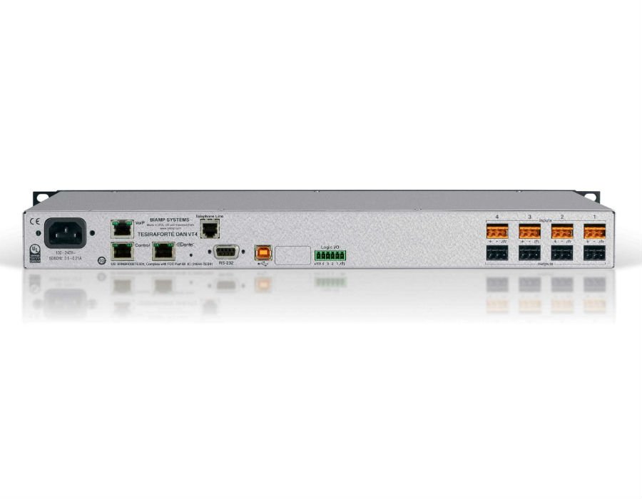The TesiraFORTÉ DAN VT4 is a digital audio server with 4 analog inputs and 4 analog outputs, and includes Acoustic Echo Cancellation (AEC) technology on all 4 inputs. It includes up to 8 channels of configurable USB audio, a 2-channel VoIP interface, a standard FXO telephone interface, and Dante digital audio networking.