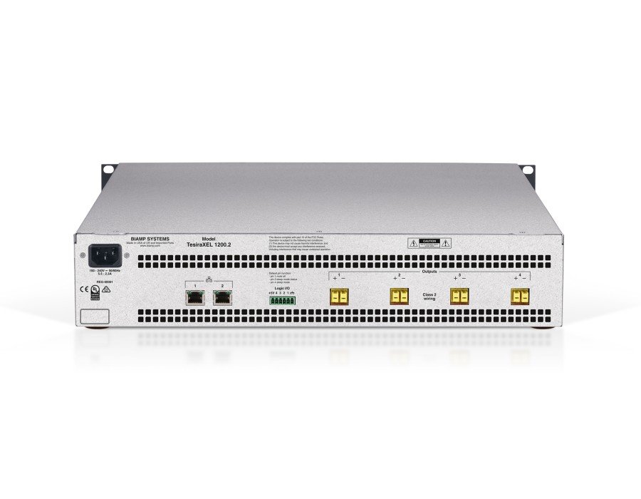 TesiraXEL™ 1200.2 is an AVB/TSN enabled, digital networked, four-channel amplifier. The 1200.2 delivers extraordinary flexibility — from power distribution, to selectable speaker impedance, to connectivity options, it’s an ideal choice. The 1200.2 is equipped with two 1200W power banks; each bank supports two channels to provide greater power density per rack unit. It leverages a unique power distribution architecture allowing users to distribute 1-100% of available power across the power bank. The TesiraXEL 1200.2 also supports both selectable impedance (4Ω, 8Ω, 70V, or 100V) and delay equalization per channel, allowing for maximum design flexibility. To streamline installations, the 1200.2 includes an audible locate function on the front panel to validate connected loudspeaker runs without requiring the amplifier to be configured. The TesiraXEL 1200.2 comes with a software-configurable media interface, allowing designers to choose their preferred network topology — redundancy, daisy chain, single-cable, or separate control and media are all supported. The 1200.2 is ideal for training rooms, lecture halls, performing arts venues, houses of worship or other applications where sound distribution or reinforcement is needed.