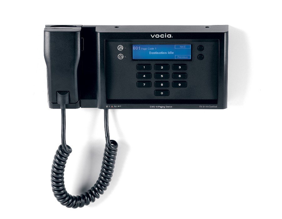 The wall-mounted paging station shall be designed exclusively for use with Biamp® Vocia® systems. The wall-mounted paging station shall provide paging audio and control data via CobraNet,® and receive Power over Ethernet (PoE), utilizing a single (CAT5) network cable to a rear panel RJ-45 connector. Ten buttons shall be provided on the front panel for recalling page codes with preambles. Multiple wall-mounted paging stations may be connected to a Vocia system by means of Ethernet switches. Four software configurable emergency priority paging levels shall be available. The wall mounted paging station shall include override, store and forward, and lock-out capabilities. Each wall-mounted paging station shall provide local digital audio signal processing, local storage of configuration data, and preambles. Wallmounted paging stations shall possess a backlit LCD screen, PIN code accessibility, and a high-quality, noise-cancelling handheld microphone. The wall-mounted paging station shall be EN 54-16 certified, CE marked and shall be compliant with the RoHS directive. Warranty shall be five years. The wall-mounted paging station shall be a Vocia EWS-10.