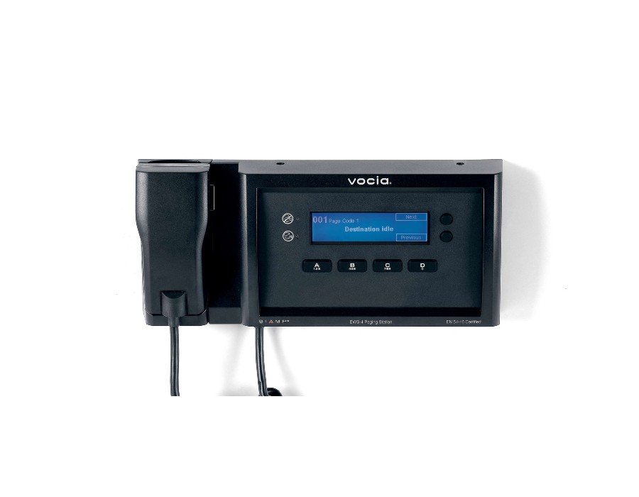 The EWS-4 is a wall-mounted networked paging station for use in Vocia systems. The EWS-4 features embedded DSP and on-board memory to support standard and advanced public address functionalities. The EWS-4 can store four user-configurable page codes. Additionally, all device-specific configuration information is stored locally, which means the EWS-4 does not rely on a centralized controller for processing and page routing. Thus, the processing, routing and storage functionality in a Vocia system is decentralized, which eliminates any centralized point of failure. As part of the Vocia system, the EWS-4 meets paging requirements for facilities of all sizes.