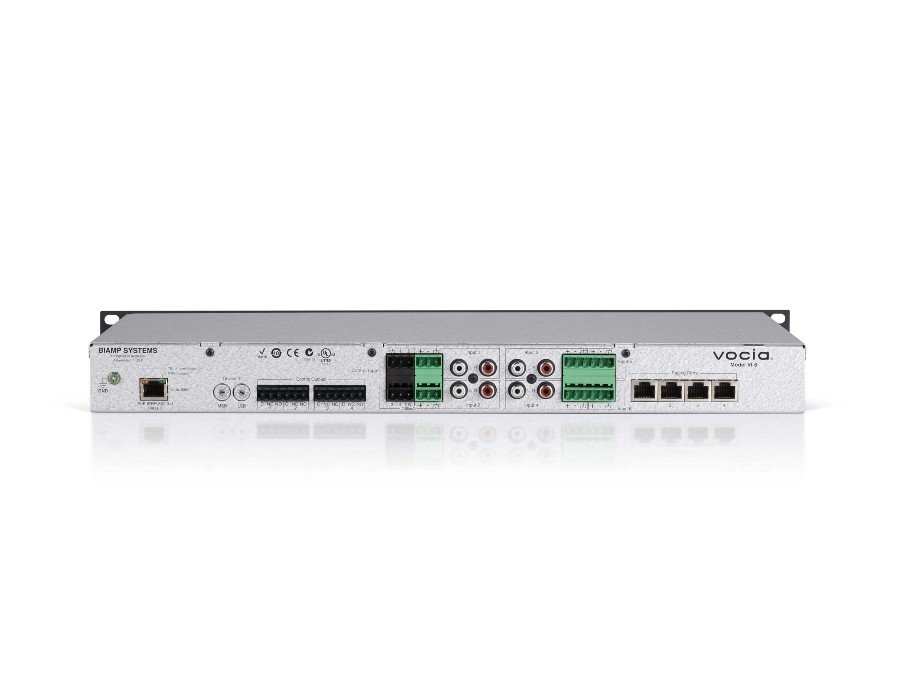 The audio input device shall be designed exclusively for use with Biamp Vocia systems. It shall be rack mountable (1RU) and provide audio and control via CobraNet.® It shall receive Power over Ethernet (PoE) utilizing a single (CAT5)network cable to a rear panel RJ-45 connector. The audio input device shall provide four sets of dual RCA connectorsplus removable terminal block connectors for line-level inputs, two microphone/line inputs with phantom power, fourpaging inputs, six CobraNet outputs, four control inputs, and four control outputs. The input device shall provide localdigital audio signal processing and local storage of configuration data. The input device shall indicate signal and clipwith LEDs on the front panel. The input device shall be CE marked and shall be compliant with the RoHS directive.Warranty shall be five years. The input device shall be a Vocia VI-6.