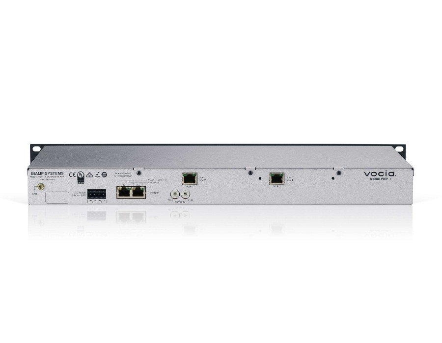 The Voice over IP interface device shall be designed exclusively for use with Biamp® Vocia® systems. It shall integrate with SIP-based VoIP call managers as a third party SIP extension. Front panel indicators shall provide Fault and Status indications as well as Status and in-use indication for each VoIP line. The unit shall support two or four VoIP lines with software-configurable level controls for inputs, preambles and prompts. Signal processing shall include five-band parametric equalization, compression and PIN code access per line. The device shall permit call actions to be associated with Vocia virtual control actions to enable DTMF control of Vocia Control Events. Programmable voice prompts shall be available for menu-driven call prompts. The device shall allow Paging Preambles to be applied and shall support Page stacking and Store-and-Forward functionality. Full logging of the unit status shall be reported to the Vocia network. It shall be CE marked shall be compliant with the RoHS directive. Warranty shall be five years. The Voice over IP interface shall be a Vocia VoIP-1.