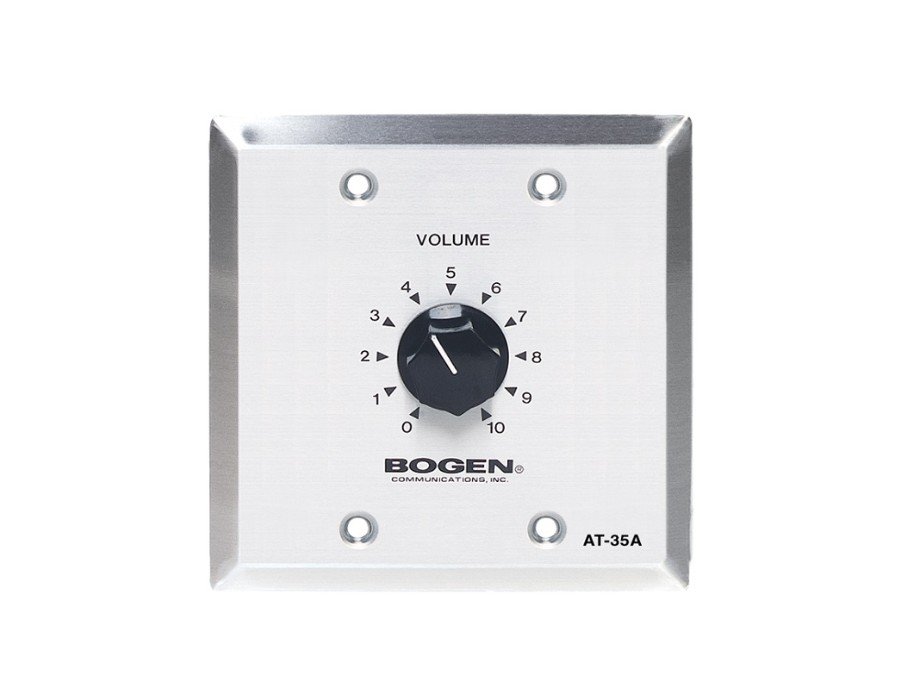 The AT35A 35W Attenuator from Bogen can control up to 35W of speakers within a 25V or 70V system. Control local volume without affecting the main volume setting. Ten attenuation steps and an off setting make it easy to find the perfect setting. Installation is simple as this control mounts in a double electrical box.