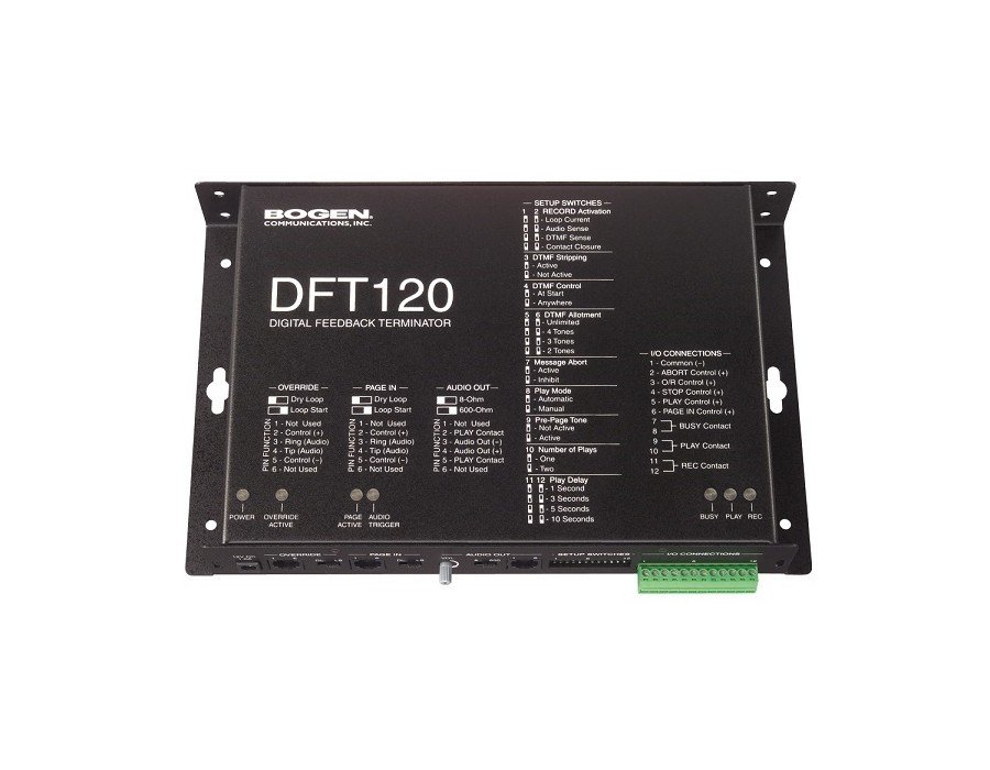 n The Bogen DFT120 Digital Feedback Terminator provides high quality recording and playback of audio pages. The DFT120 breaks the acoustical feedback loop created by the telephone handset and paging speaker. The page is first recorded and then played back as soon as the source handset has been put on-hook. High capacity paging is accomplished by the DFT120ʼs record during playback and page stacking capabilities. User selectable loop start trunk or 4 wire dry loop input interface and selectable 8-ohm or 600-ohm output impedances allow the DFT120 to directly connect to a wide range of customer premise equipment.