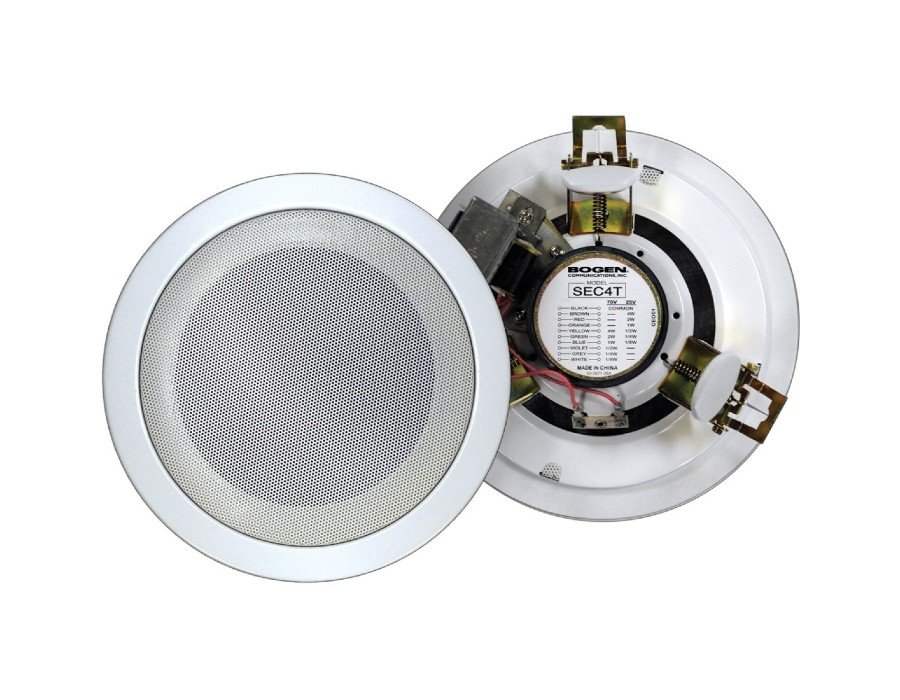 The Bogen SEC4T is a compact ceiling speaker that installs into a ceilling tile.  Despite its size, the speaker produces consistent, clear sound and comes with spring-loaded clamps for fast and easy installation. Mesh cover protects the speaker cone from debris. The SEC4T fits ceiling tiles up to 1 1/4″ thick.