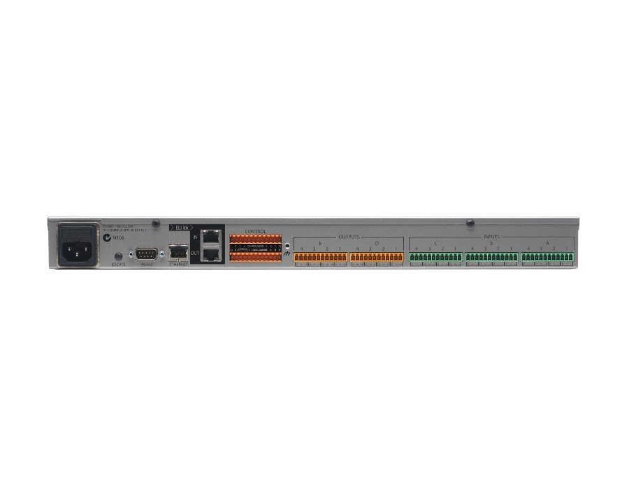 This processor features a low latency, fault tolerant digital audio bus of 48 channels which uses standard Category 5e cabling giving a distance of 100m between compatible devices. Fiber media converters can be used to increase the distance between devices to over 40km.