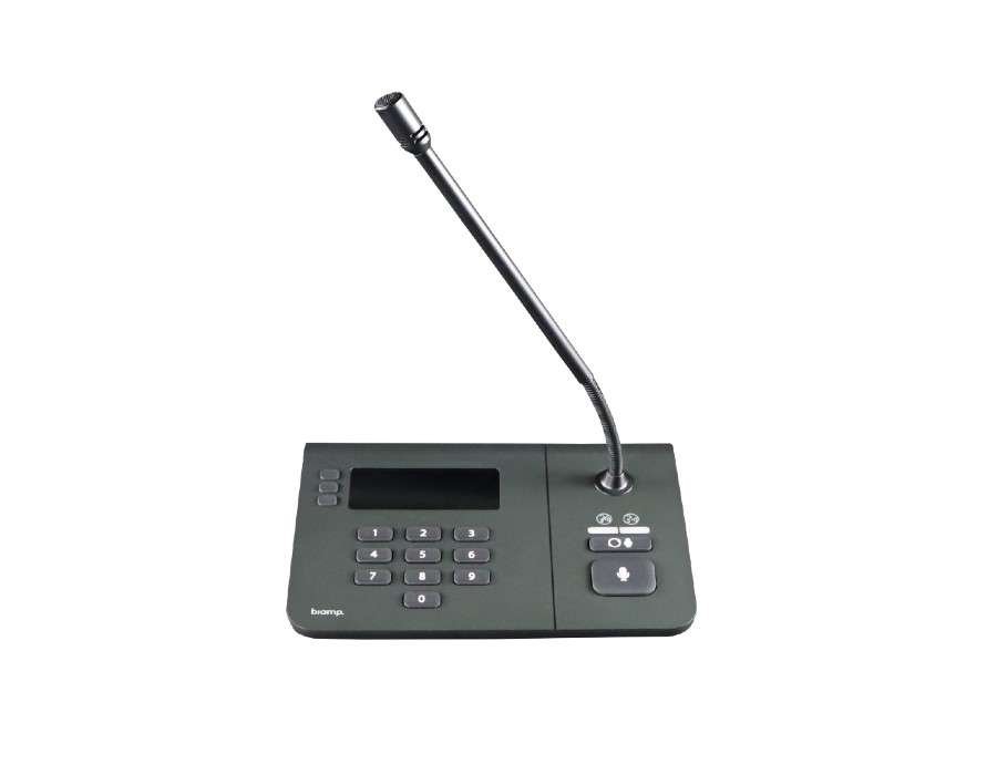 The convenience paging station shall be designed for use with Biamp® Tesira® systems. The convenience paging station shall provide control data and digital audio over user-selectable AVB or Dante® via an RJ-45 connector and shall be powered by PoE (IEEE 802.3at Class 3, 15.4W). Four buttons shall be provided on the front panel for recalling page codes with optional preambles. Multiple convenience paging stations may be connected to the system by means of Ethernet switches. The convenience paging station shall support up to 16 software configurable paging priority levels. The convenience paging station shall support push-to-talk (PTT) paging via the handheld microphone. Each convenience paging station shall provide local digital audio signal processing and local storage of pre-recorded messages and preambles. The convenience paging station shall have a backlit LCD screen, PIN code accessibility and a high-quality, noise-cancelling handheld microphone. The convenience paging station shall be NRTL listed to comply with UL 62638-1 and CSA C22.2 #62368-1 and shall be CE marked and compliant with the RoHS directive. Warranty.