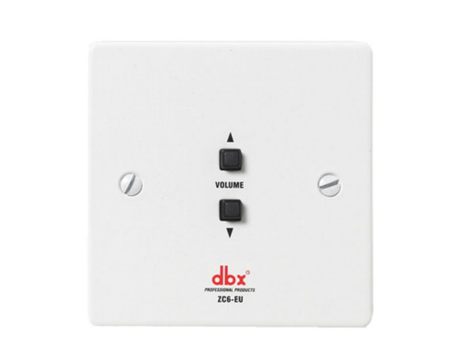 The remote device shall provide computer programmable push-button up/down volume control for the dbx® ZonePRO™ devices. The remote device shall have DIP switches allowing identification with connection to the processing device via CAT 5 cable on RJ-45 connectors. The device shall be a dbx ZC-6-EU remote controller.