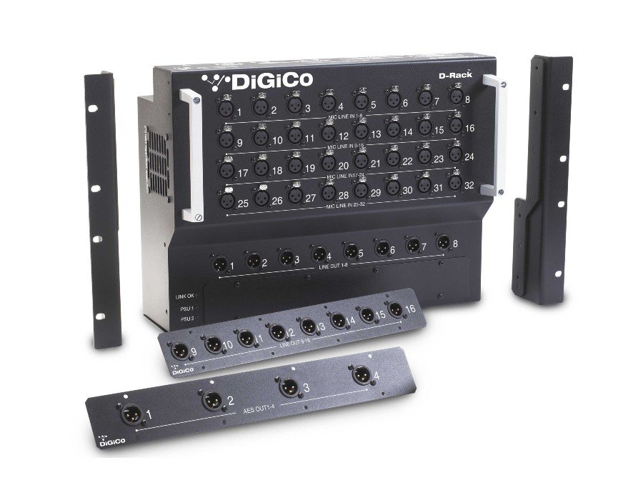 The DiGiCo D-Rack comes as standard in the SD9 system and is available as an option on all SD-Series consoles. The D-Rack provides 32 microphone inputs, 8 line outputs and 8 modular outputs that can be selected as either analogue or AES, providing a maximum capacity of 32 ins and 16 outs. With a digital CAT5E cable to connect to the console work surface, the hum and noise of analogue multicores are eliminated.