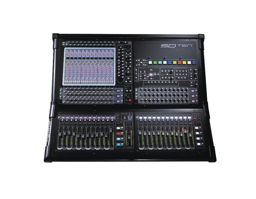 SD10-24 features two banks of 12 motorised faders and one master fader, each of which benefits from its own high resolution LED bar graph meter. In the centre of the worksurface sits the familiar 15-inch backlit colour-keyed TFT touch screen, home of the console’s super-intuitive control interface.