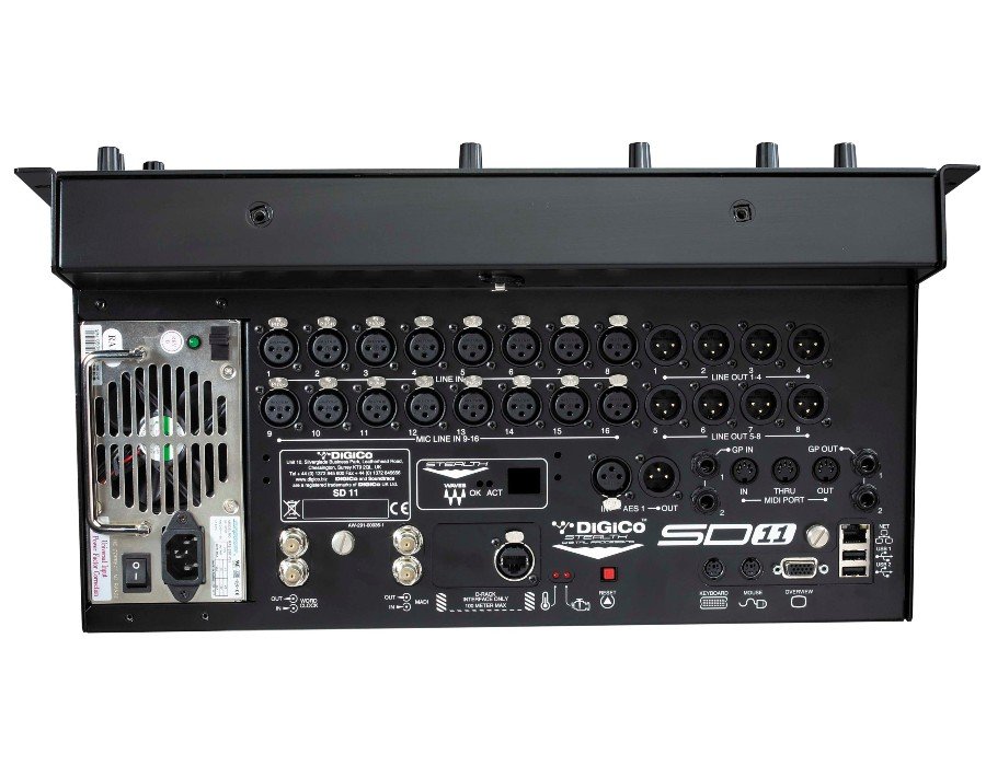 The SD11B sports a mighty local I/O section, including 16 mic/line inputs, eight line outs, two mono AES/EBU, one MADI port, and one dedicated D-Rack port. The console connects seamlessly with the DiGiCo 32 input, 8-output (expandable to 16) remote I/O D-Rack, while a factory-fit Optocore option connects to all DiGiCo racks and consoles in a redundant loop.