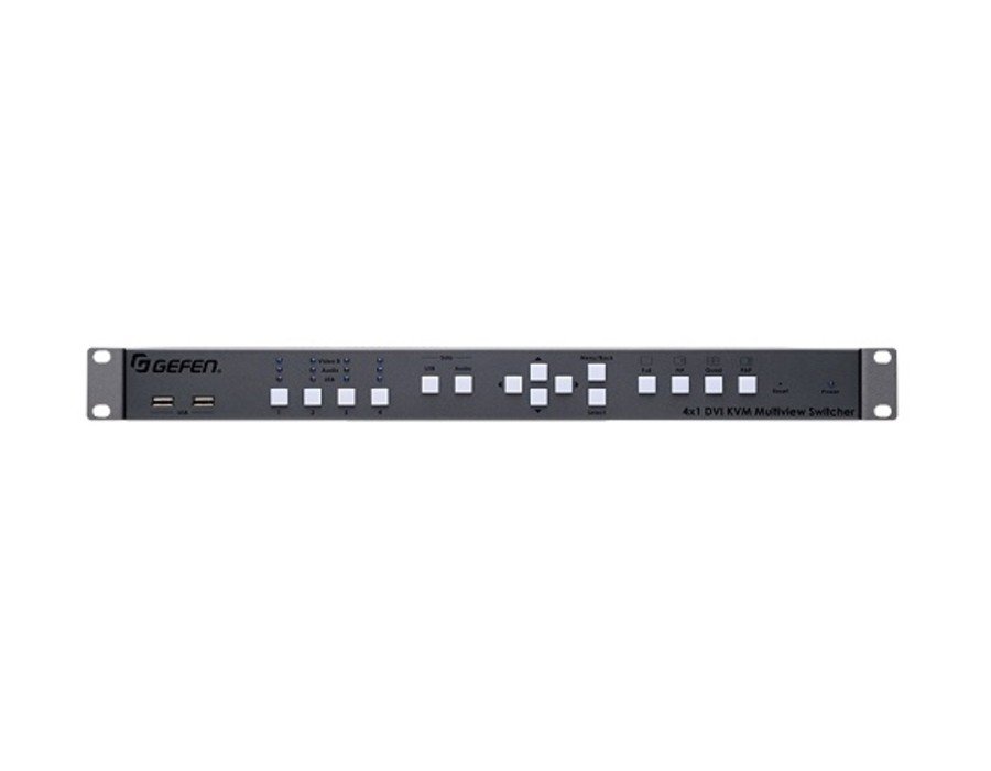 The EXT-DVIK-MV-41 is the perfect solution for controlling four computers from a dual monitor workstation. The operator can observe up to 4 pictures on one screen, while a second monitor can be switched to display the picture that needs closer attention. This product is HDCP compliant, supporting input and output resolutions up to 1920 x 1200 (WUXGA) and 1080p Full HD. The two front panel USB ports and/or Bi-Directional audio (mic and headphones/speaker) can be independently routed from any of the four computers to the workstation. Four default factory presets provide most commonly used arrangements of windows on a display, including single window output, Picture-In-Picture, Quad view, and Picture-And-Picture. The 4×1 DVI KVM Multiview Switcher is controllable via front panel, keyboard/mouse, and RS-232. An intuitive on-screen Graphical User Interface simplifies system configuration and operation. Up to 8 DVI KVM Switchers can be daisy-chained together to create an elaborate 32 computer workstation. This product is field firmware upgradable with the Gefen Syner-G™ software suite.
