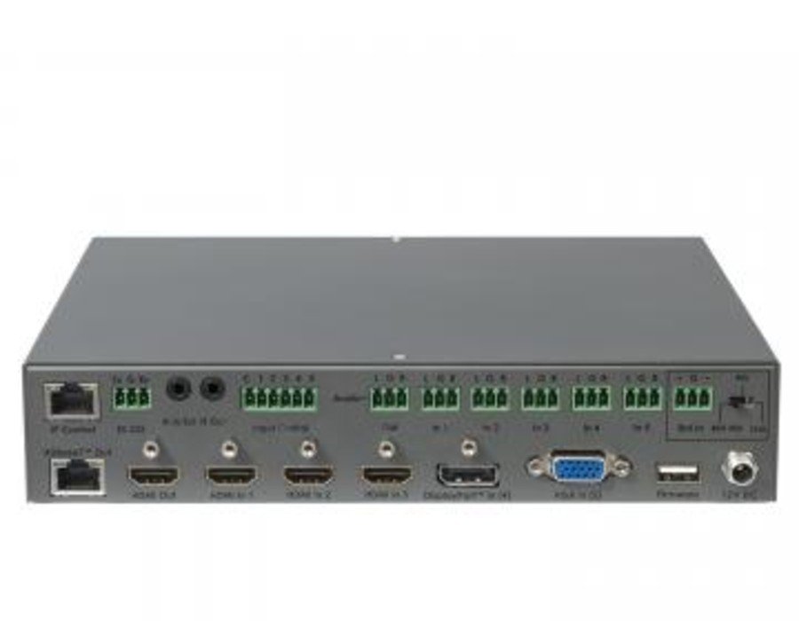 The EXT-4K600A-MF-51-HBTLS is a 5×1 Presentation Switcher with three 4K 600 MHz HDMI, one DisplayPort 1.2, one VGA, five independently assignable stereo analog audio, & one balanced/unbalanced microphone/line input. The latter features switchable 48V Phantom Power and Ducking. The five video inputs, along with their embedded or assigned audio, can be switched automatically or manually. Control options include the front panel, hand-held IR remote with On-Screen-Display, electrical IR, RS-232, Telnet/UDP, web server interface, & contact closure.