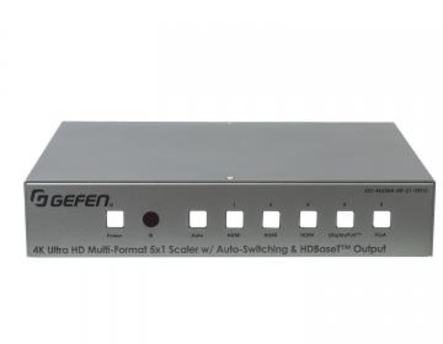 The split HDMI and HDBaseT outputs feature a scaler, configurable to 3840 x 2160, 30 Hz, 4:4:4. They feed a local and a remote display simultaneously, adding flexibility in larger presentation environments. The Switcher and its recommended Receiver (the EXT-UHDA-HBTL-RX, sold separately) use Gefen’s implementation of the HDBaseT™ technology to extend the HDMI output of the Switcher up to 230 feet/70 meters at 1080p Full HD and up to 130 feet/40 meters at 4K, using one CAT-5e or better cable. The HDMI and DisplayPort™ inputs support resolutions up to 4K DCI (4096 x 2160) 60 Hz 4:4:4, with HDCP 2.2 and 1.4. The HDMI input & output, and the HDBaseT™ output support 2 channels of LPCM digital audio. The VGA input supports resolutions up to WUXGA (1920 x 1200) and 1080p Full HD. When used with third-party adaptors, the VGA input also supports Component (YPbPr) and Composite video. The Switcher features an analog L/R audio de-embedder. The optional Receiver also features analog and digital audio (optical and coaxial) outputs. Any or all audio outputs can be connected to sound-reinforcement systems at the source side or the remote end, adding impact and presence to AV presentations. The 5×1 Switcher features Advanced EDID Management to ensure that sources are optimized for the displays in use. The Switcher, when used with the optional HDBaseT™ Receiver, provides 2-way RS-232 and IR extension, facilitating control of the Switcher, AV sources placed near the Switcher, and the remote display or another device placed near the Receiver unit. Industry-standard Power-Over-HDBaseT™ (POH) technology provides power from the Switcher to the Receiver, over the same cable that extends the AV signal. The Switcher features an integrated IR Sensor on its front panel as well as an electrical IR input. If the switcher is mounted in a location where its IR sensor is not within line of sight, a Gefen EXT-RMT-EXTIRN IR Extender Module or a third-party controller with electrical IR output can be connected to the IR input on its back panel. The 5×1 Switcher features a compact form-factor that can be placed on a shelf or securely mounted on or under a surface. The optional Receiver’s small, ultra-low-profile enclosure can be securely surface-mounted, and conveniently hidden away from sight in the equipment closet or behind the display. Locking HDMI ports on the Switcher & locking power jacks on both units ensure long-lasting and reliable connections.