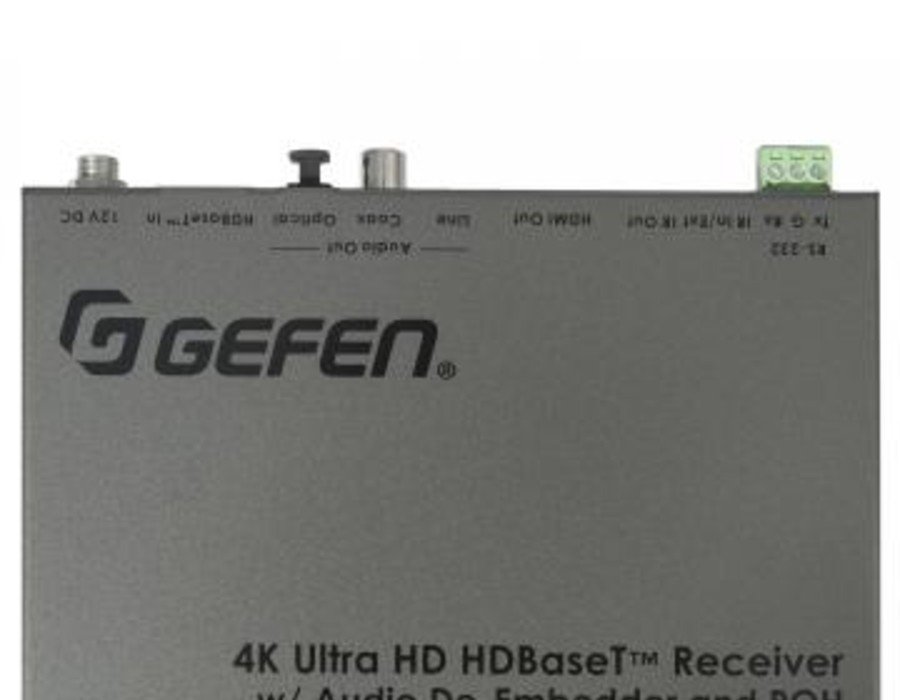 The Gefen EXT-UHDA-HBTL-RX is a high-performance HDBaseT™ Receiver that can extend HDMI up to 70 meters (230 feet) at 1080p and 40 meters (130 feet) at 4K, over a single CAT-5e cable. It also de-embeds analog L/R, TOSLINK® optical digital, and coaxial digital audio from the video for use with a separate audio system, enhancing the impact of presentations. This Receiver uses Gefen’s implementation of the HDBaseT™ technology with enhanced functionality. It accommodates 10.2 Gbps of data throughput and 300 MHz TMDS Clock frequency, and supports HDMI 2.0 resolutions up to 4K Cinema-DCI (4096 x 2160 to 30 Hz 4:4:4) and 4K Ultra HD (3860 x 2160 to 60 Hz, 4:2:0, or 30 Hz 4:4:4), with HDCP 2.2 or 1.4. Highest performance multichannel digital audio including 7.1 channels of LPCM and HBR (High Bit Rate) digital audio formats, such as Dolby Atmos®, Dolby® TrueHD, DTS:X™, and DTS-HD Master Audio™ are passed through to the HDMI output. The EXT-UHDA-HBTL-RX also extends RS-232 and 2-way IR when used with a compatible Sender unit, facilitating the control of A/V sources placed near the Sender from the viewing location, and sending commands from the head end to control the display or another device placed near the Receiver unit. It can also send RS-232 commands from a third-party controller placed by the Receiver, for switching, scaler controls, and EDID management of a compatible Sender unit. Bi-Directional HDBaseT™ standard POH (Power Over HDBaseT™) technology can supply power remotely from the Receiver unit to a compatible Sender unit, or it can pass power from a compatible Sender unit to the Receiver, using the same CAT-5 cable that extends the HDMI signal. Only one of the two units will need a power supply. This feature simplifies installation in cases when an electrical outlet may not be available near the source or the display. The Receiver’s small, ultra-low-profile enclosure can be securely surface-mounted and conveniently hidden away from sight behind the display. It also accommodates a Gefen locking power supply plug for secure connection.
