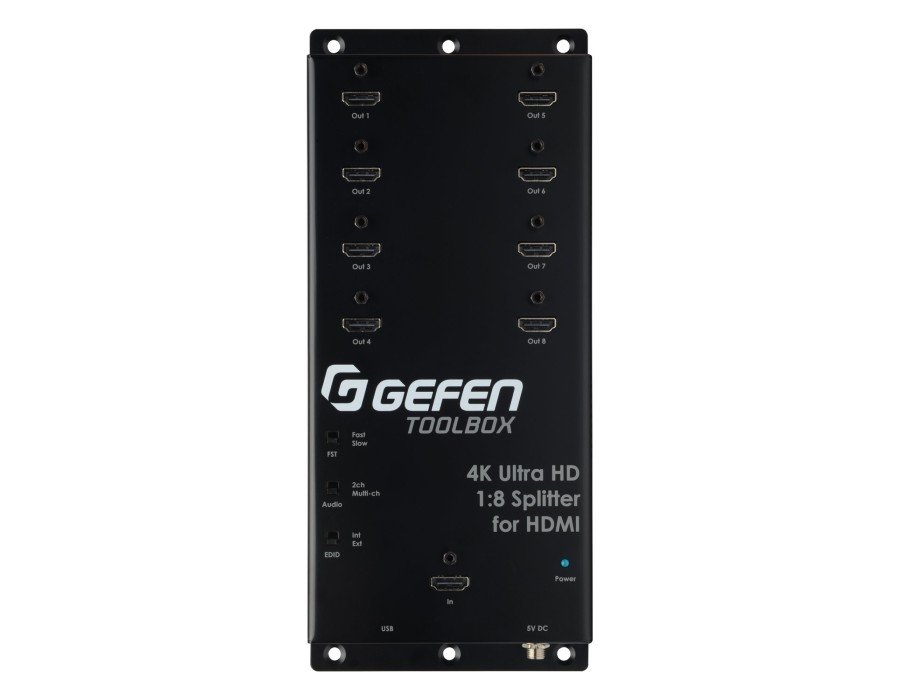 The Gefen GTB-HD4K2K-148C Ultra HD Splitter for HDMI routes one Ultra HD source to eight 4K Ultra HD displays. It eliminates the lengthy HDMI authentication process, and allows disconnecting, reconnecting, or powering down HDTV displays without any of these activities causing picture loss in other displays within the same distribution system. The choice between built-in and passed-through EDIDs, and the ability to configure the EDID for 2-channel or multichannel operation help customize your AV system to meet its operational requirements . The Gefen 1:8 Splitter is a high performance and capable choice for any small or large 4K video distribution system. This product features Fast Switching Technology (FST). FST is a Gefen firmware implementation for HDMI products.